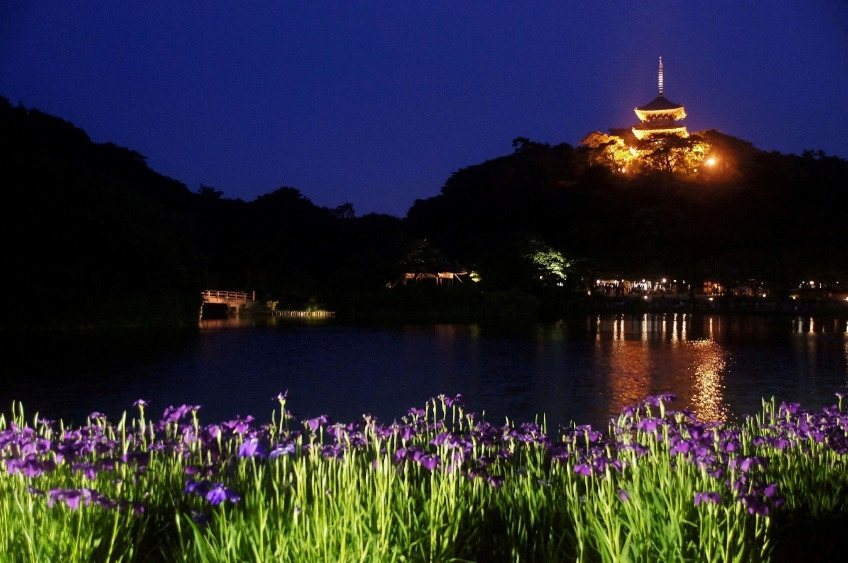 ライトアップされた三重塔と旬を迎えたハナショウブがお出迎え。