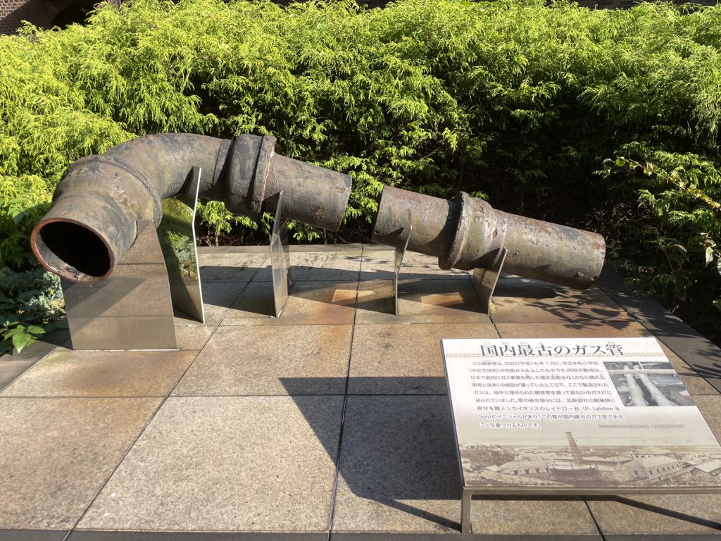 日本大通り駅近くにある、横浜都市発展記念館の中庭には、本町小学校から発見された日本国内最古のガス管が展示されています。