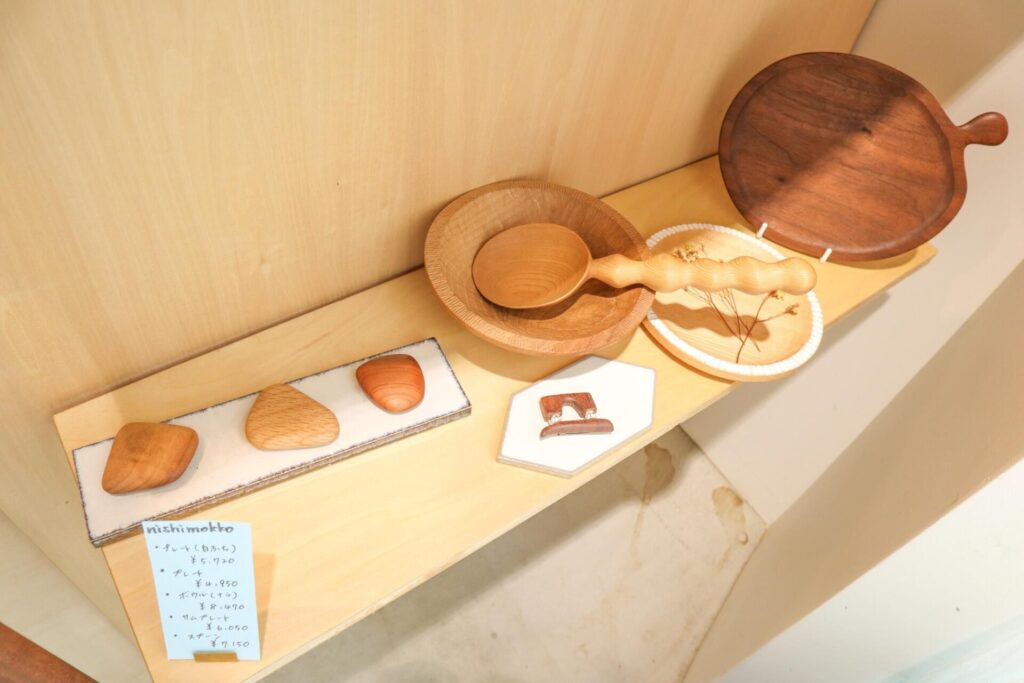 お店に並ぶ商品は、主に設計事務所と繋がりのある作家さんの作品です。保育園のサインを作ってくれた作家さんからは、木製食器を。扉の取手を作ってくれているおもちゃ屋さんからは、木製のおもちゃを買い付けています。ときには、SNSで見つけた素敵な雑貨を仕入れることもあるのだとか。