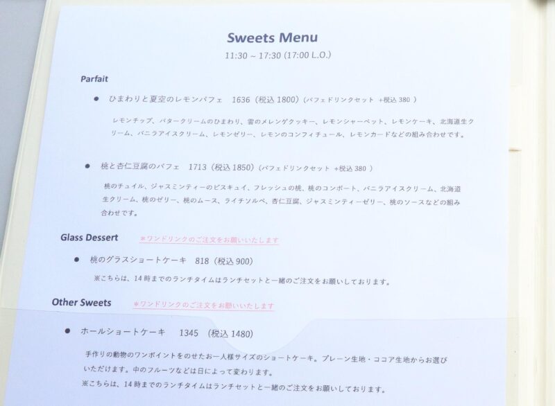 「Eat & Smile」さんの看板メニューは、「季節のパフェ」です。旬の食材を使ったものが常時2〜3種類用意されており、この日は夏のパフェが2種類と、秋のパフェが1種類ありました。メニュー表に写真は掲載されておらず、「クッキー・シャーベット・ケーキ」など、中に入っている材料が書かれているのみです。