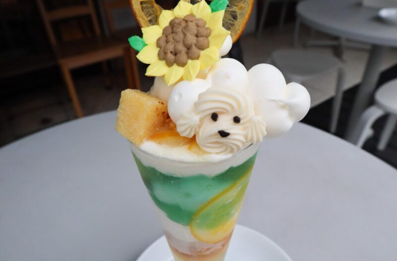 この日、筆者が選んだパフェは2種類。夏限定「ひまわりと夏空のレモンパフェ」には、精巧に作られたひまわりのそばに、太陽を思わせるレモンチップと雲を形取ったメレンゲクッキーが乗せられ、グラスには快晴の空が広がっていました。