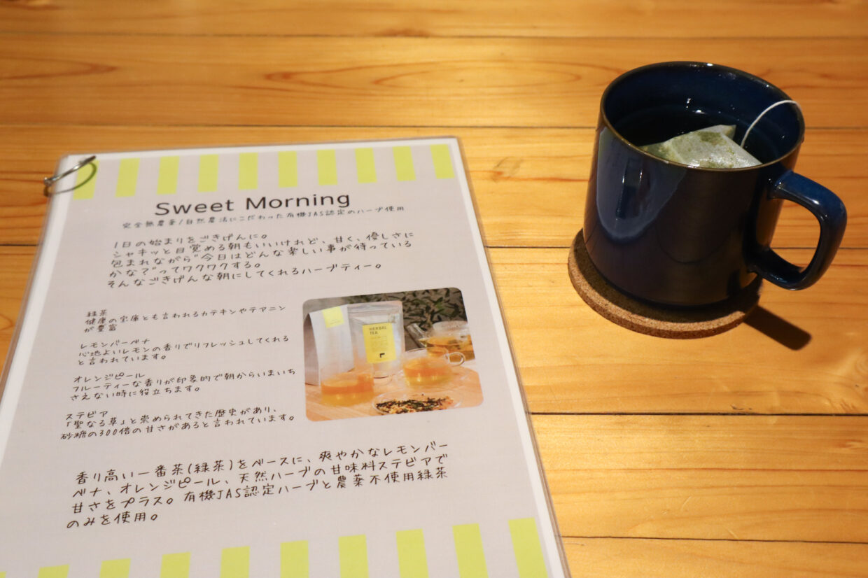 お店ではほかに、「ヘルシーデイタイム」「ヒーリングナイト」「ハーブクレンズ」の3種類を取り揃えています。「スイートモーニング」は一口飲むと気分がほっこり。リラックスできる味わいでした。
