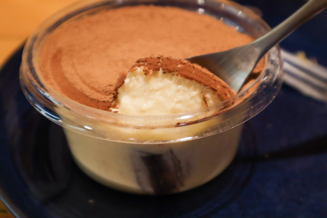 人気ナンバーワンの「米粉甘酒ティラミス」は、ココアパウダーの表面をスプーンですくうと、なかには真っ白なクリームが層になっています。クリームはとろとろとなめらかで、甘酒を使っているせいか、さっぱりした風味です。