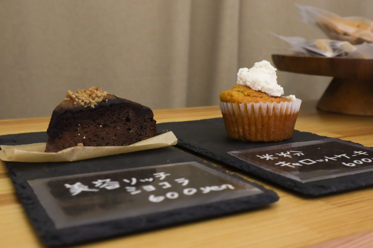 米粉以外にも使用している材料にこだわりがあり、「シフォンケーキ・キャロットケーキ」以外のメニューには甘酒を使用。白砂糖は使っていません。また、乳製品を使わないヴィーガン対応の「甘酒チョコ」も作っており、ココナッツオイル・ココア・甘酒などで仕上げています。