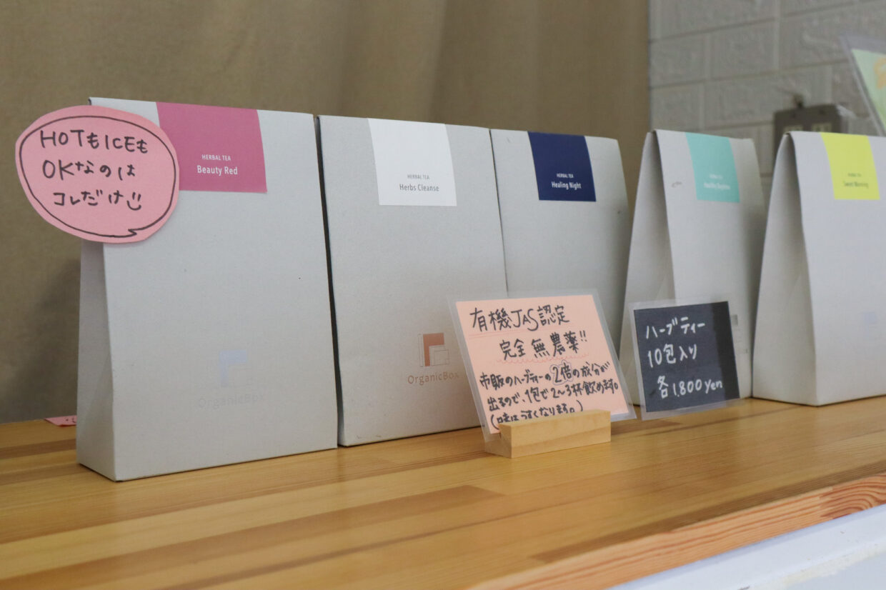 このハーブティーは長谷川さんが旅先の熱海で出会ったもので、自然農法にこだわり、完全無農薬で栽培されたハーブが使われています。