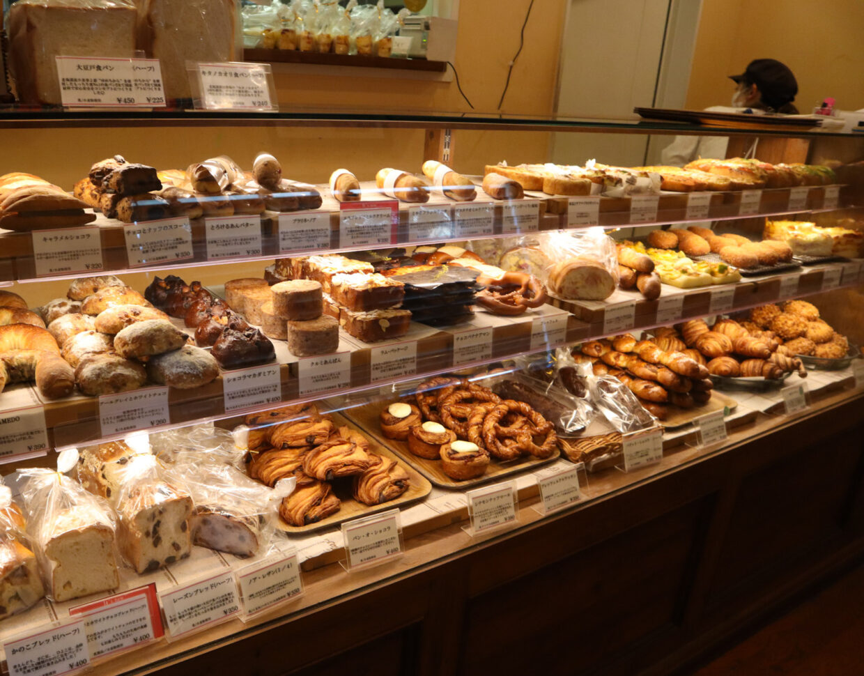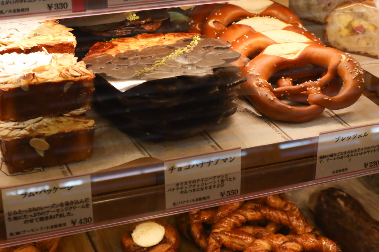 ショーケースには、朝一番に焼き上げられたパンが、ぎっしりと並んでいます。定番の食パン・バゲット・クロワッサンのほか、パンオショコラ・明太子フランス・プレッツェルなど、バリエーション豊かなメニューが勢揃い。常連らしきお客さまは迷う様子もなく注文していましたが、初めて訪れた筆者はついつい目移りしてしまいました。