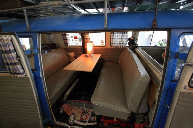 店内にドンと構えているのは、鮮やかな空色のワーゲンバス。