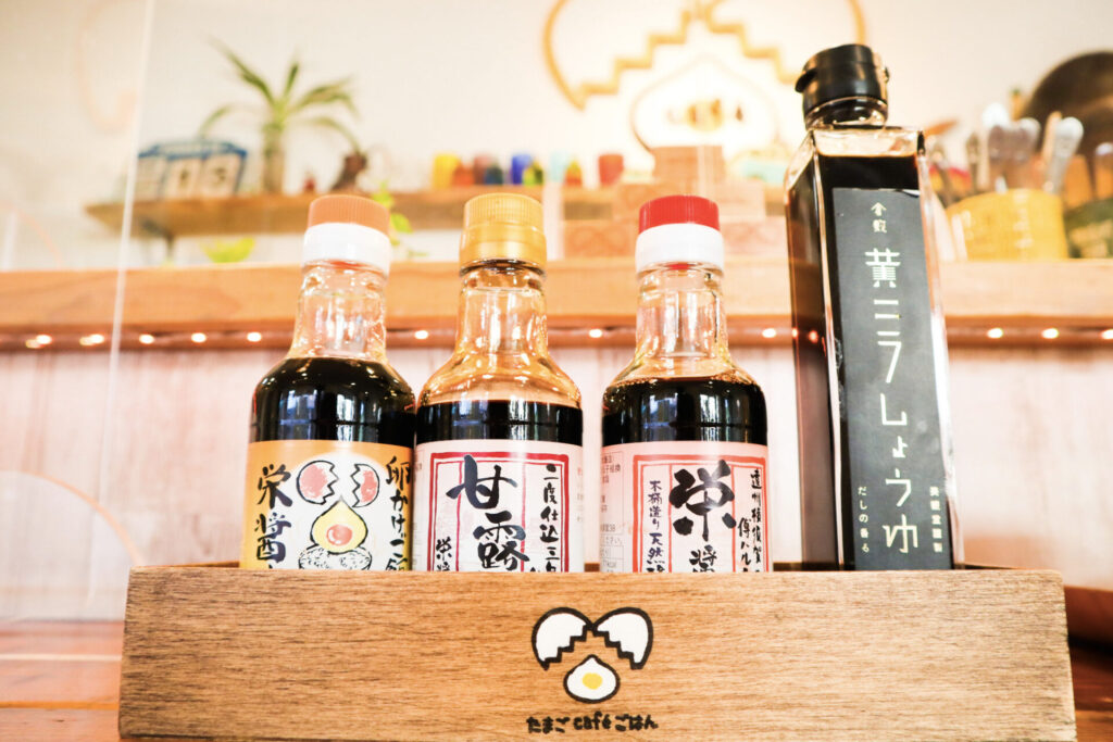 店内には4種類の醤油が用意されており、好きなものをかけて食べることができます。取材当日はおすすめの「黄ニラしょうゆ」でいただきました。地鶏の卵がとろっと濃厚な味わいで、いつもよりちょっと上質な卵かけご飯。お腹も心も満たされました。