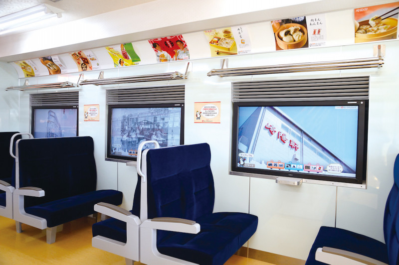 電車の窓に見立てたタッチパネルディスプレイをお客さま自らが操作していただくことで、シウマイの製造工程や崎陽軒の歴史など、知りたいことを映像でチェックできちゃいます。
