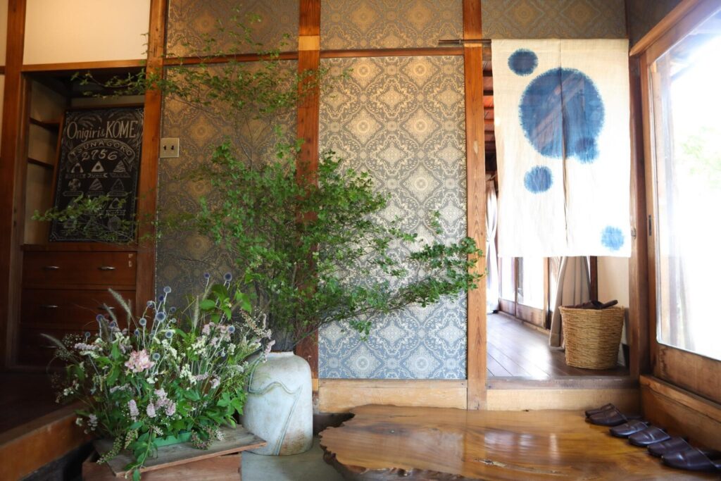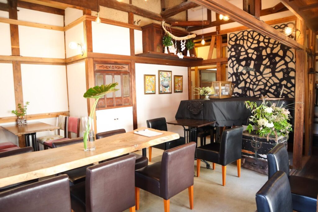 体に優しいヴィーガン料理が味わえる綱五郎さんですが、その魅力は料理だけではありません。お店は築100年の古民家を利用しており、実家のような懐かしさを感じる雰囲気。長年使い込まれた木の温もりとアンティーク調の内装で、その場にいるだけで自然と心がほどけていきます。