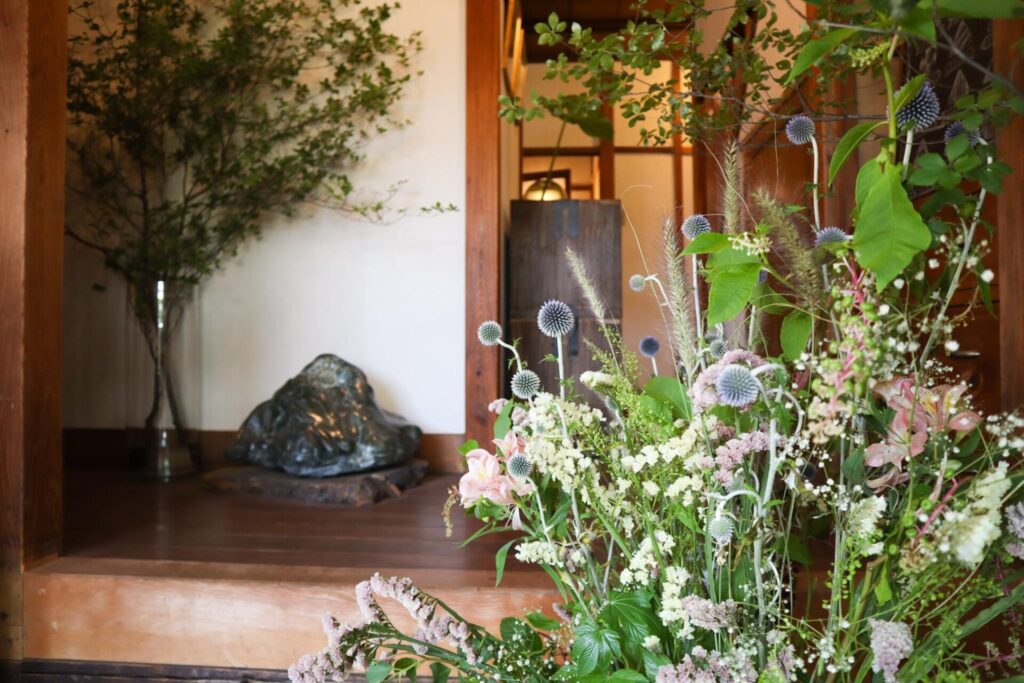 店内で一際目を引くのが、中庭にある磐座(いわくら)です。磐座は「神が宿る石」ともいわれ、神社などで見かけることが多いもの。栗原さんのお祖父様が移設したものだそうですが、「どこから持って来たのか」「なぜ中庭に飾ったのか」、そのいきさつは謎に包まれているのだとか。