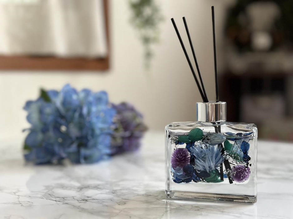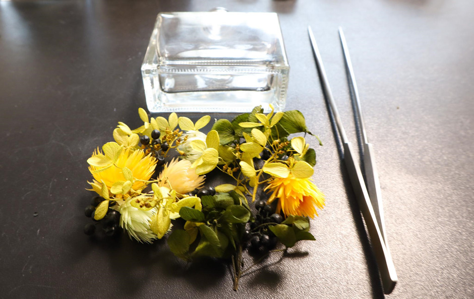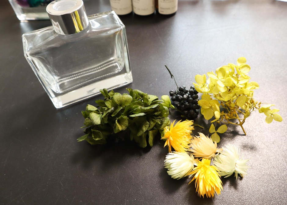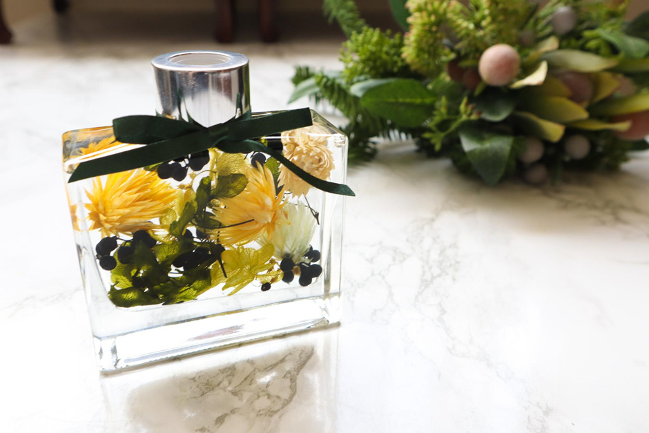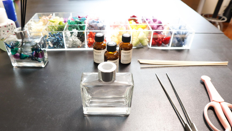 取材当日はプリザーブドフラワーを使った、「フレグランスハーバリウム」レッスンを体験させていただきました。「フレグランスハーバリウム」とは、色鮮やかな花材をハーバリウム液で浸けたものにエッセンシャルオイルを加え、ルームフレグランスとして使用できるものです。