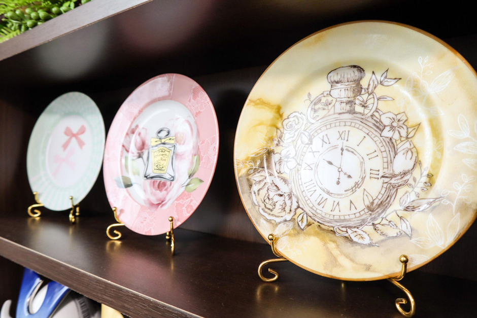 特に人気なのが、「アールポーセ」のレッスンです。絵柄の入ったシールのような転写紙を組み合わせて作るため、お子さんでも簡単に制作できます。艶やかな質感で、できあがりの完成度が高いのも人気の理由です。