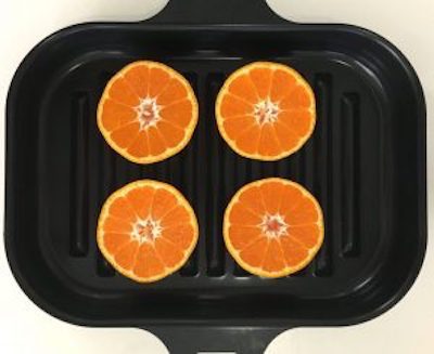 ①みかんは皮をむかず半分に切り、ラ・クックに並べ、蓋をして焼く。