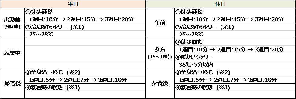 「入浴」と「軽い運動※」、「就寝時の瞑想(自律訓練法)」を組み合わせた、おうちでも気軽にできるプログラムです。