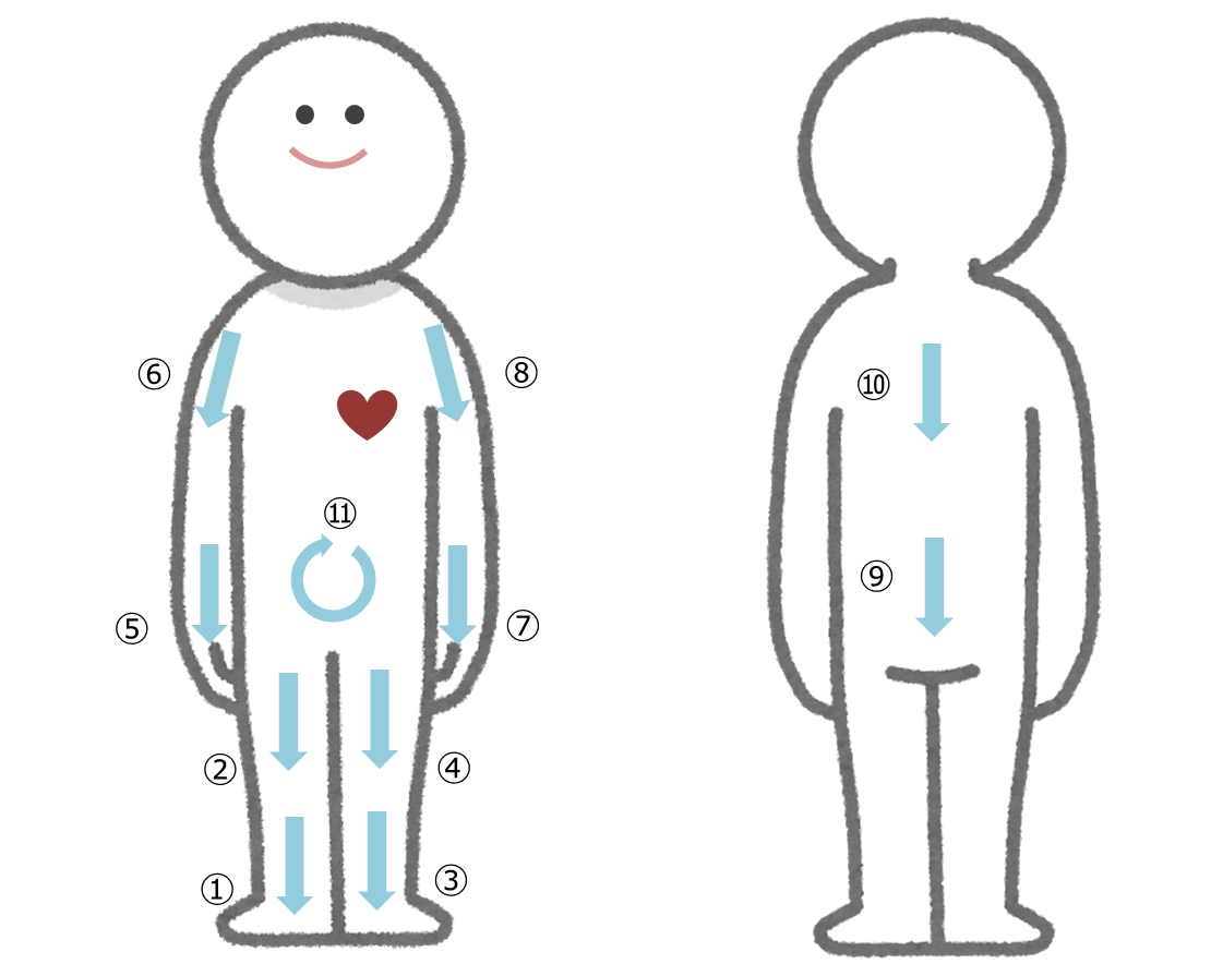 25~28℃くらいのシャワーを①~⑪の順序で、心臓から遠い位置から徐々にかけていきます。(負担に感じる場合は⑪は不要です。)