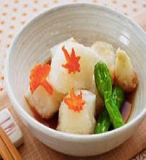 お皿に②を盛り付け、おろした大根と生姜を添えて、温めただし汁をかける。