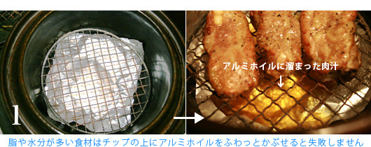 ※チップの上のアルミホイルが食材の脂・水分を受け止め、チップの不燃を防ぎます。