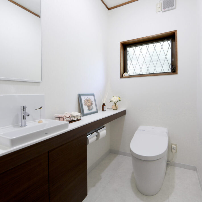 タンクレスならではの広々とした空間に小物などが置けるカウンターをつけたところ、想像以上にくつろげる場所になったとご満足いただきました。