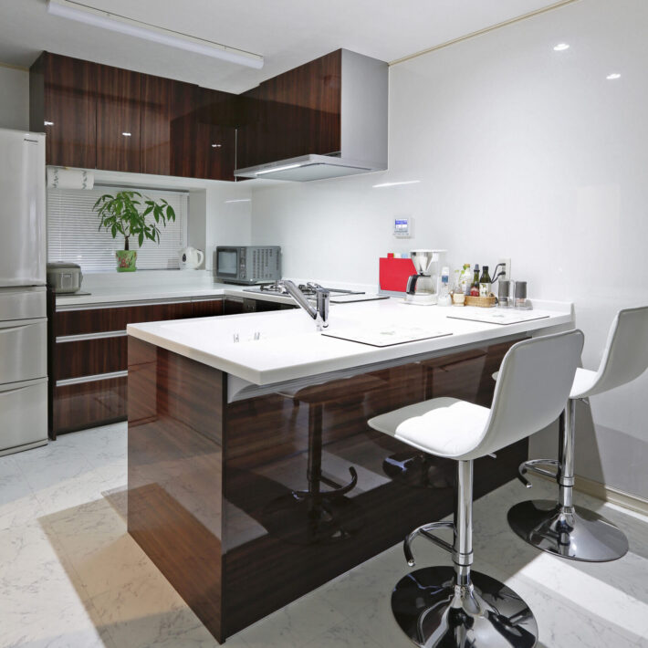一番のご要望は家族と会話しやすいキッチンとのことでしたので、対面カウンターやゆとりのある調理スペース、たっぷりの収納を兼ね備えたプランをご提案しました。