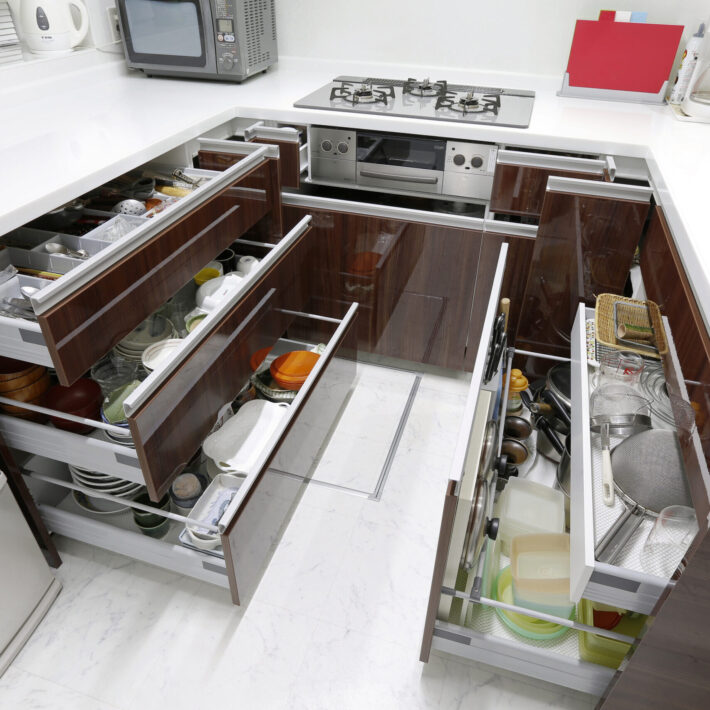 収納も使いやすく、腰をかがめて奥の物を出し入れしていた以前の観音開きの収納とは段違いの使いやすさです。