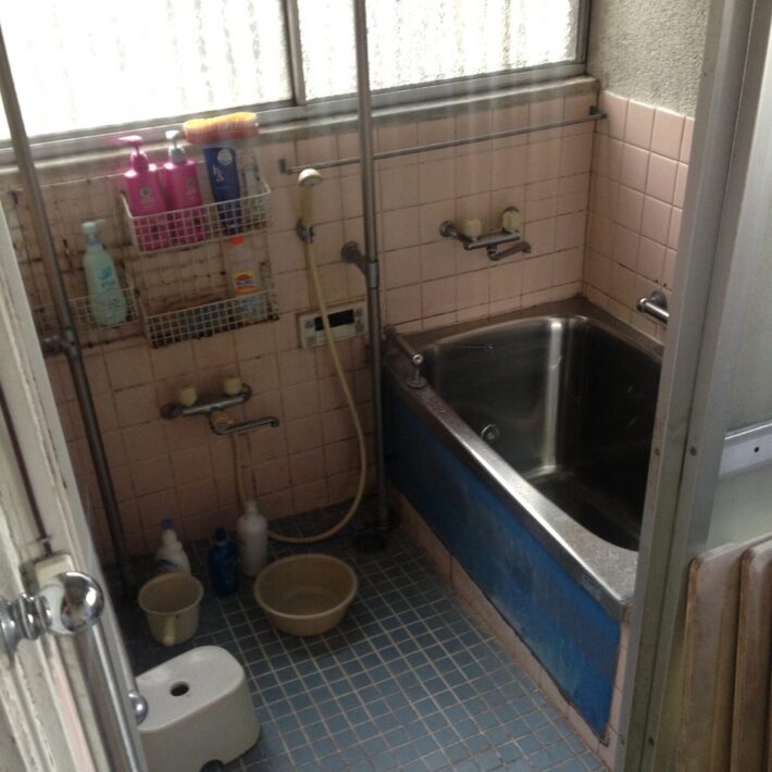 タイル貼り、大きな窓、ステンレスの浴槽は寒くお湯も早く冷めてしまうので改善したい。