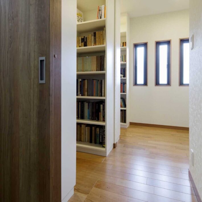 造り付けの本棚を部屋いっぱいに天井まで配置し大容量の書庫を実現。