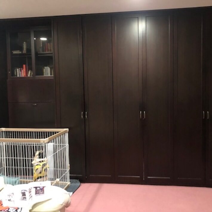 リフォーム前は壁側全体が棚となっていましたが、今回はあえて左側に扉を入れず吊戸棚にして、下にワンちゃんのケージを余裕を持って入れられるスペースにしました。