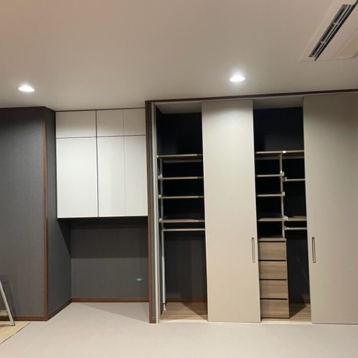 リフォーム前は壁側全体が棚となっていましたが、今回はあえて左側に扉を入れず吊戸棚にして、下にワンちゃんのケージを余裕を持って入れられるスペースにしました。