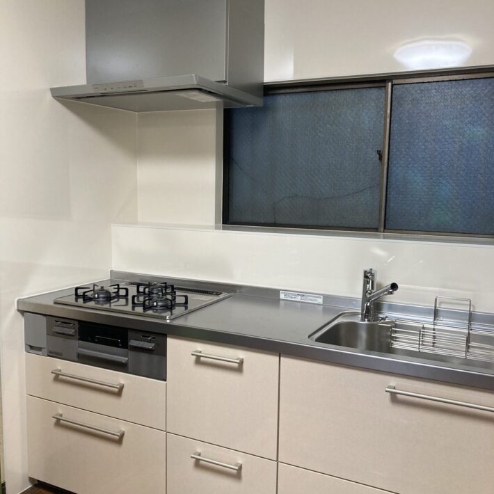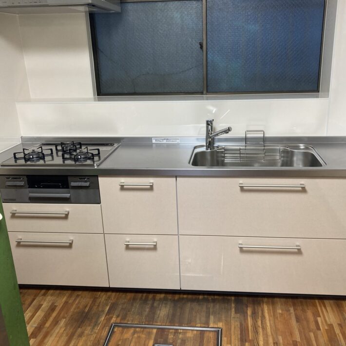 コンロがキッチン台に組み込まれて段差が少なくなりお掃除がラクになるシステムキッチンに。