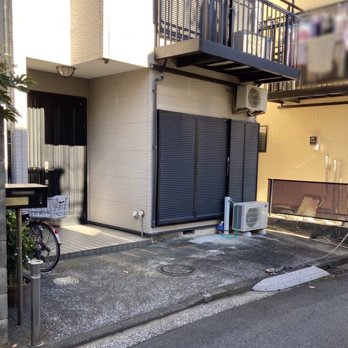 フェンスと地面の隙間を広くならないように、門扉を開いた時に地面の勾配に当たらない範囲でなるべく低く門扉を取り付けて、地面との隙間を少なくなるよう工夫しました。