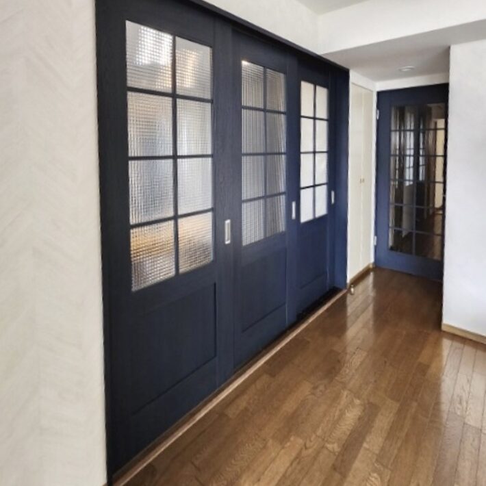 ネイビーの建具と花柄の壁紙を使用することで、華やかでありながら落ち着いた印象の空間に仕上がりました。