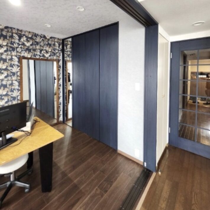 ネイビーの建具と花柄の壁紙を使用することで、華やかでありながら落ち着いた印象の空間に仕上がりました。