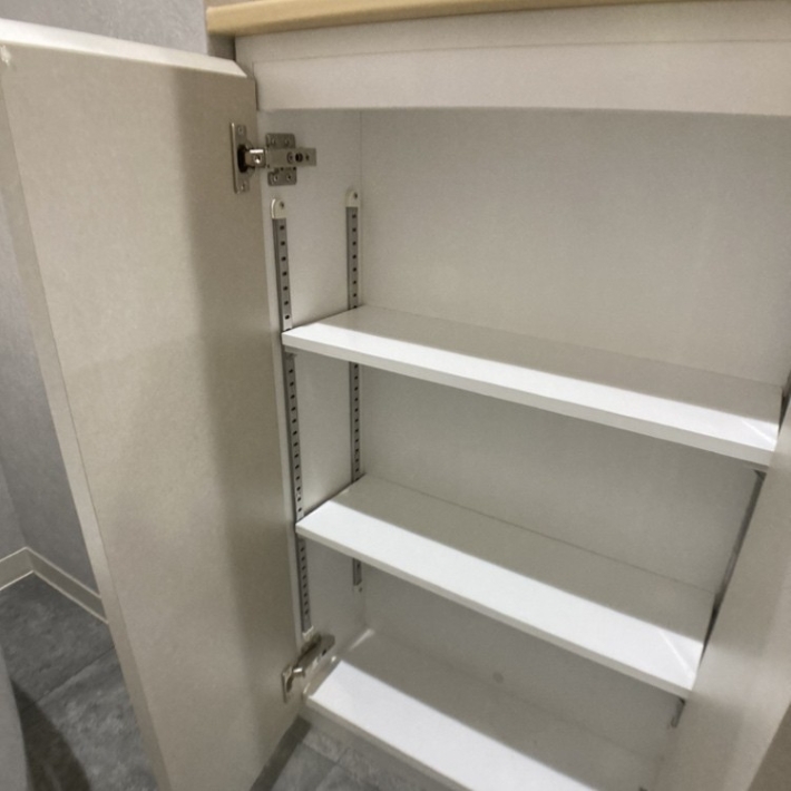 当初はトイレ交換のみのご希望でしたが、お話を伺ううちに、使用していない手洗い器部分を活用したいとご相談いただきました。スペースが限られていたため、既製品ではなく造作で収納棚を設置し、使用していなかった手洗い器が収納に替わりご満足いただけました。