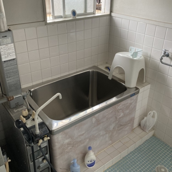 在来浴室からシステムバスへ在来浴室の床がタイルのお風呂で、浴室内にバランス釜が設置されていました。浴槽が広いシステムバスにしたいとご相談をいただき、給湯器を屋外に設置することで、ひろびろとした浴槽を実現しました。