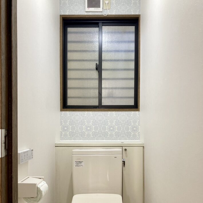 トイレ空間をすっきり&おしゃれに トイレ空間をすっきり&おしゃれに目の前に洗面台があるため、トイレ内の手洗いを省略。さらに窓面のクロスをアクセントにすることで、すっきりとした印象と遊び心のある空間に仕上げました。