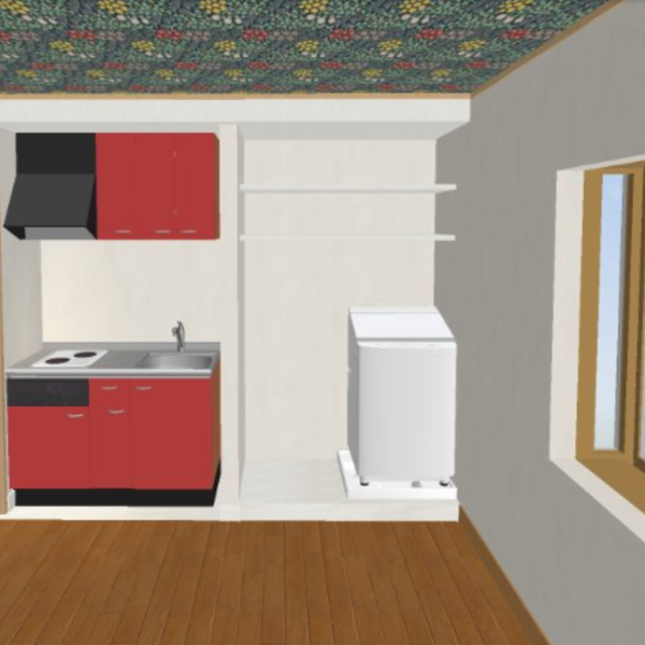 プライベート空間を確保壁面の収納スペースを活用し、洗濯機置き場とクリナップのミニキッチン「コルティ」を設置し、家事がスムーズにできる空間に。アンティレッドの扉カラーで華やかさをプラスしました。