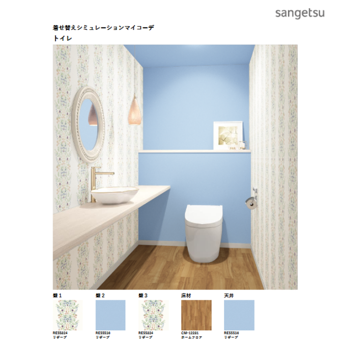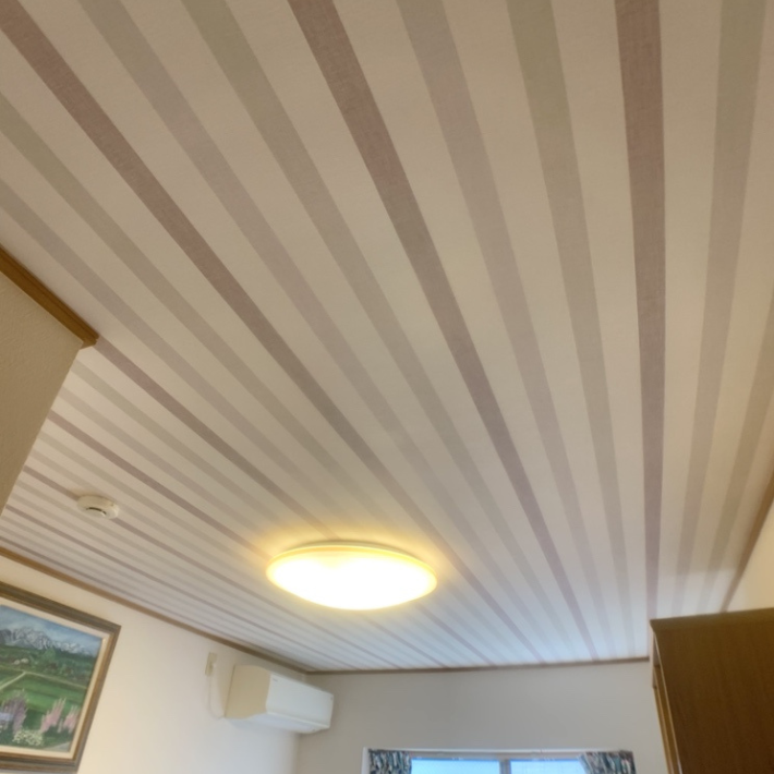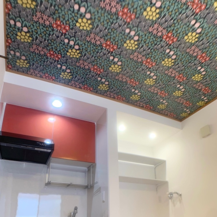 クロスで空間にアクセントサンゲツのシミュレーションでイメージを確認しながら、キッチンや居室の天井クロスは花柄やストライプ柄をお選びいただきました。それぞれのお部屋に異なるデザインのクロスを取り入れ、個性ある空間に仕上がりました。