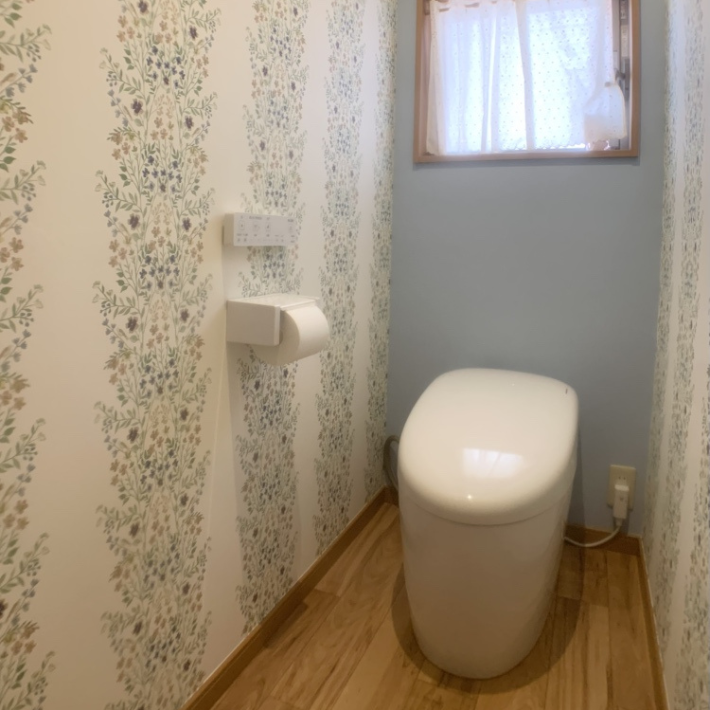 トイレ空間も心地よくリニューアル1階・2階ともにTOTO「ネオレスト」をお選びいただきました。クロスや床材は木目調や花柄のデザインで優しい雰囲気になり、清潔感とデザイン性を両立することができました。