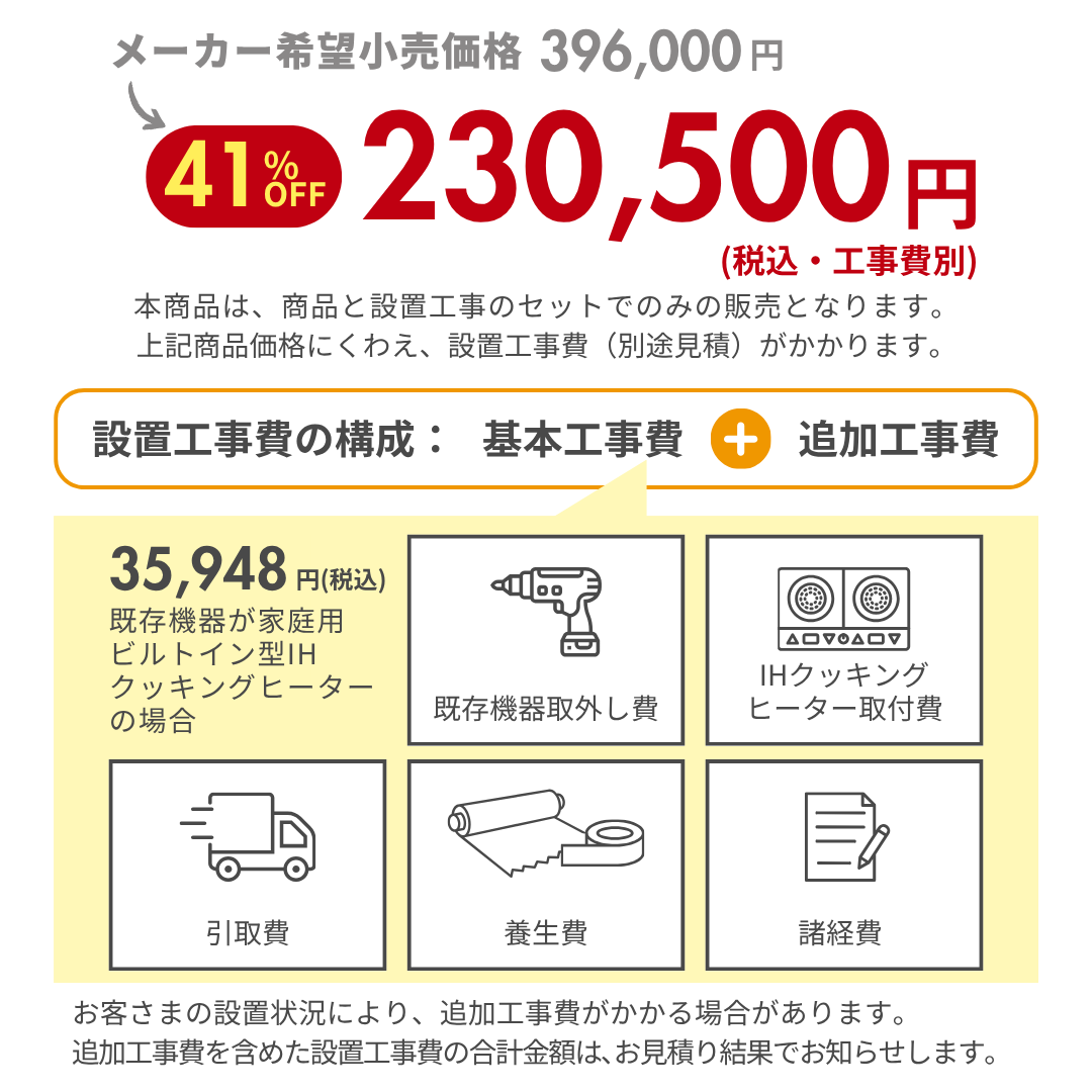 - 本商品は、商品と設置工事のセットでのみの販売となります。上記商品価格にくわえ、設置工事費(別途見積)がかかります。