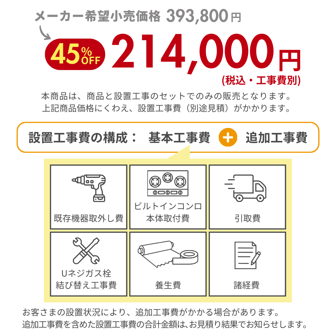 - 基本工事費に含まれるのは、既存機器取外し費、ビルトインコンロ本体取付費、引取費、Uネジガス栓結び替え工事費、養生費、諸経費です。