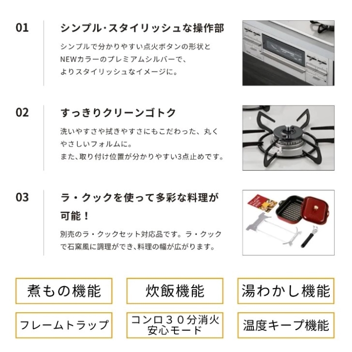 コンロ30分消火 安心モード | ボタンひと押しで通常消し忘れ消火120分が30分で自動消火します。 |